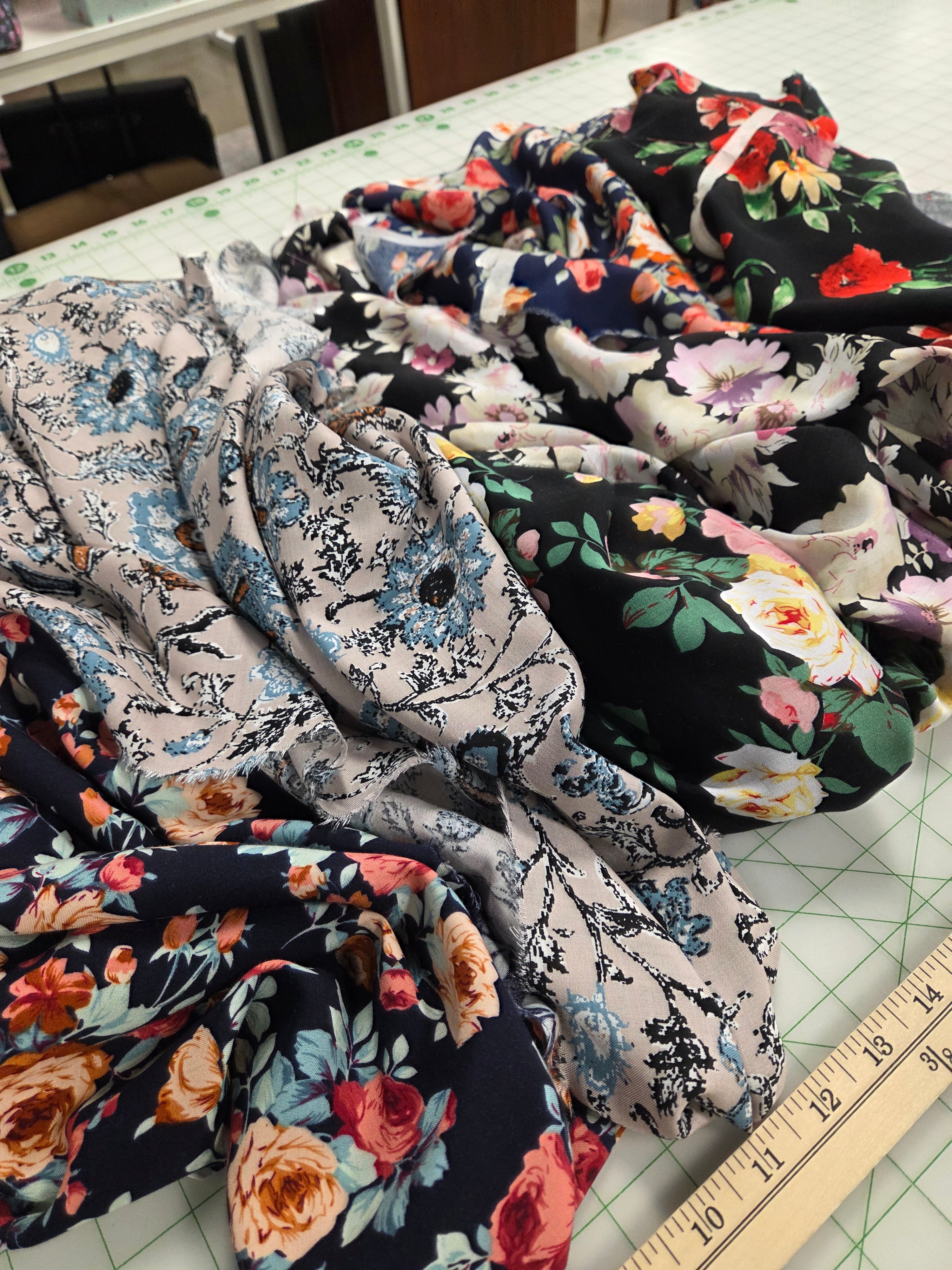 Lots of Fabric End Cuts, Remnants, Sample Yardages from Cutting Houses. Looks always changing! Amazing pricepoints to try out new types of apparel fabrics at a fraction of the cost.