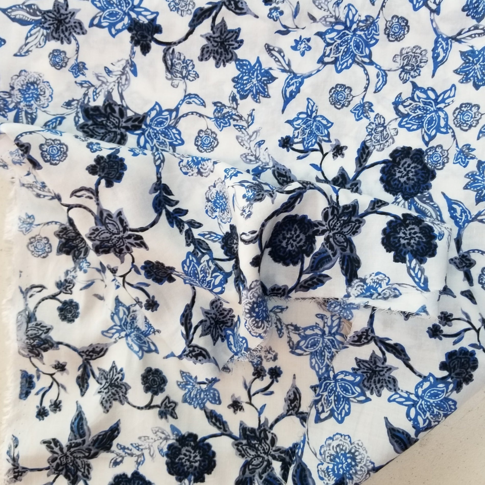 Designer LA Deadstock Ivory and Scattered Blue Floral Rayon Challis Woven-by the yard