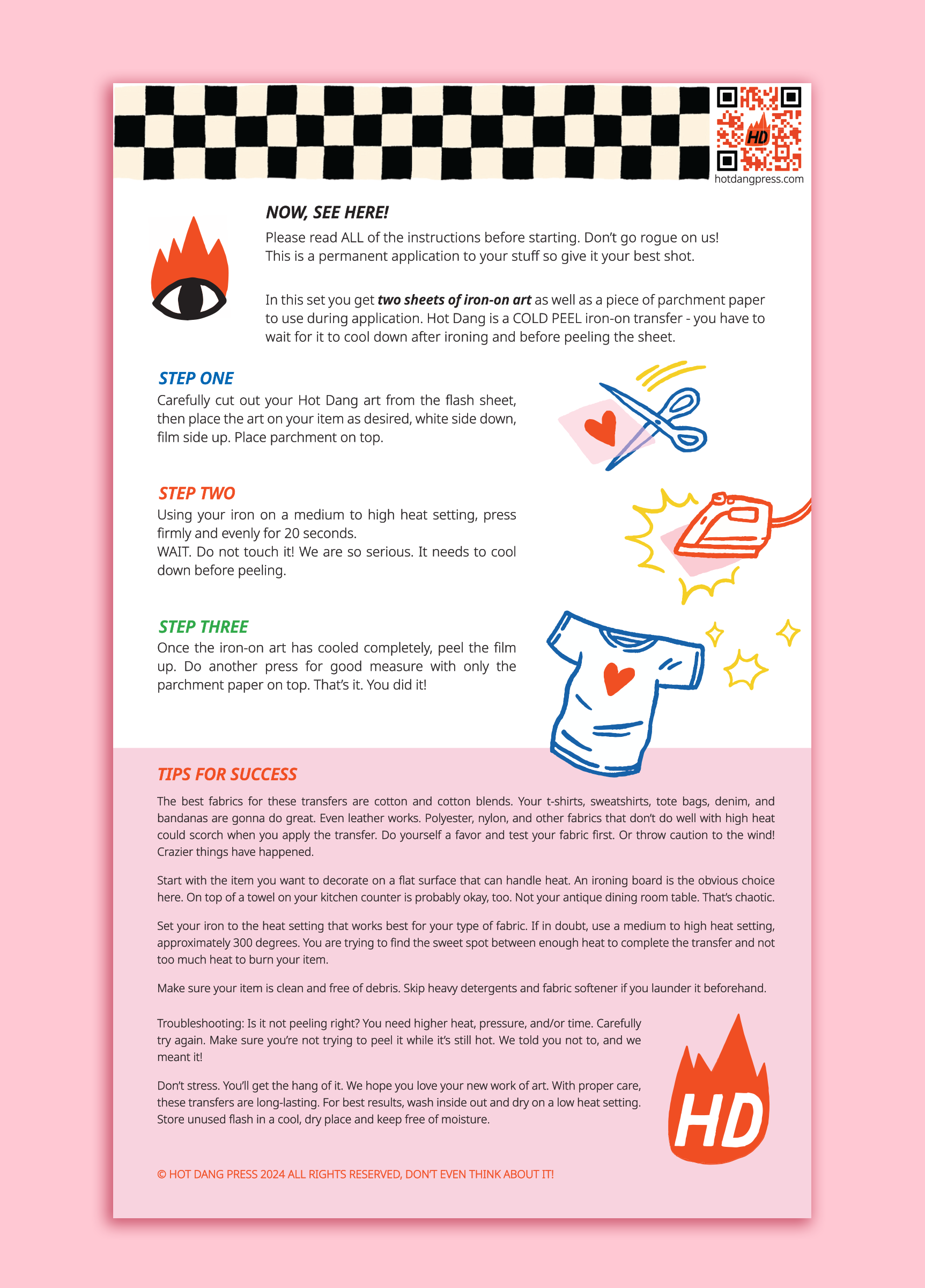 You bring the heat! All you need is an iron. Sheets are 5.25x7.5 inches.