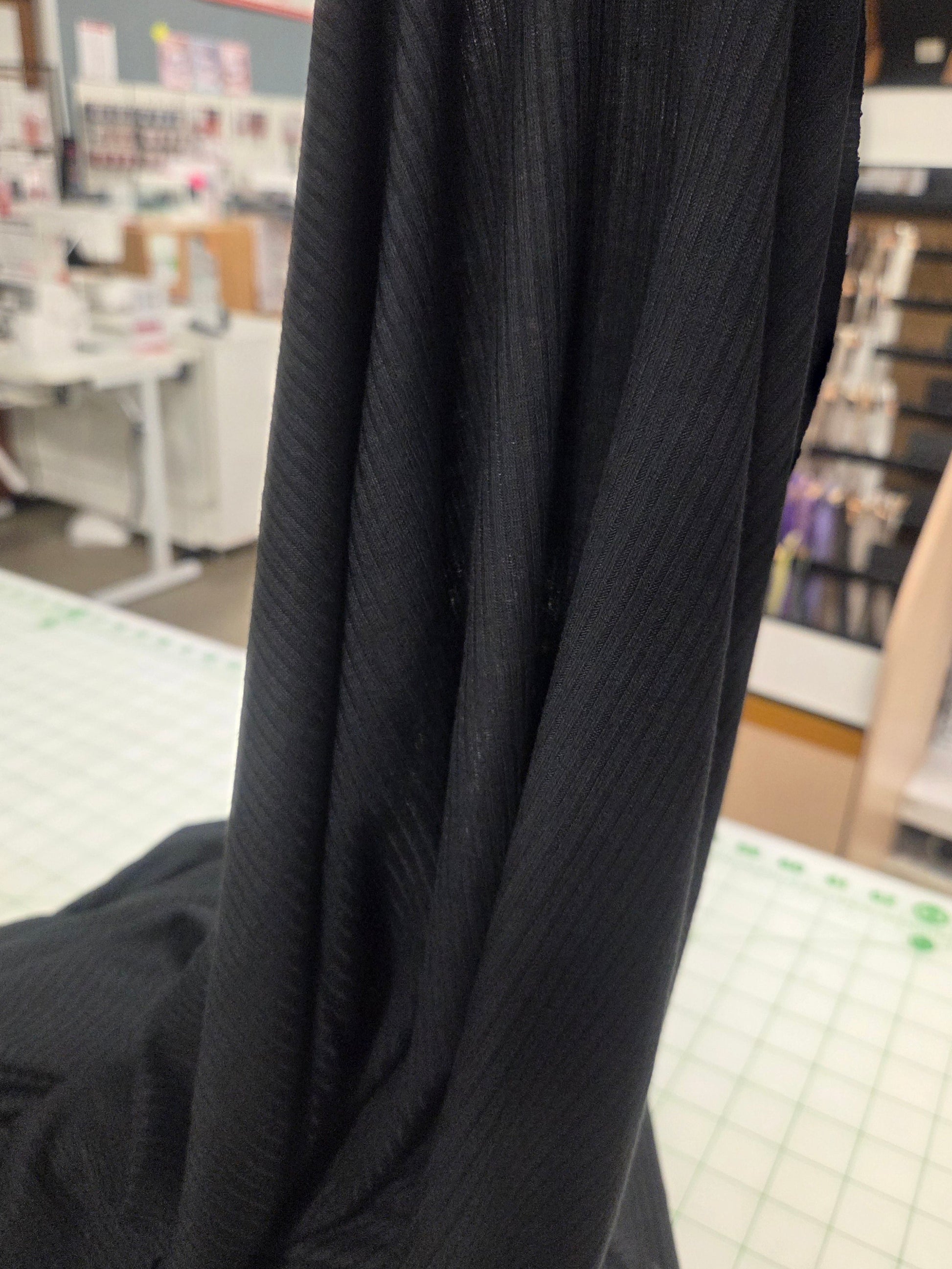 Description: 4 way stretch, lightweight 4x2 black rib knit. Breathable, drapey and perfect for tanks, light cardigans, dresses, tees. Recovery is great for this viscose spandex- bounces back.