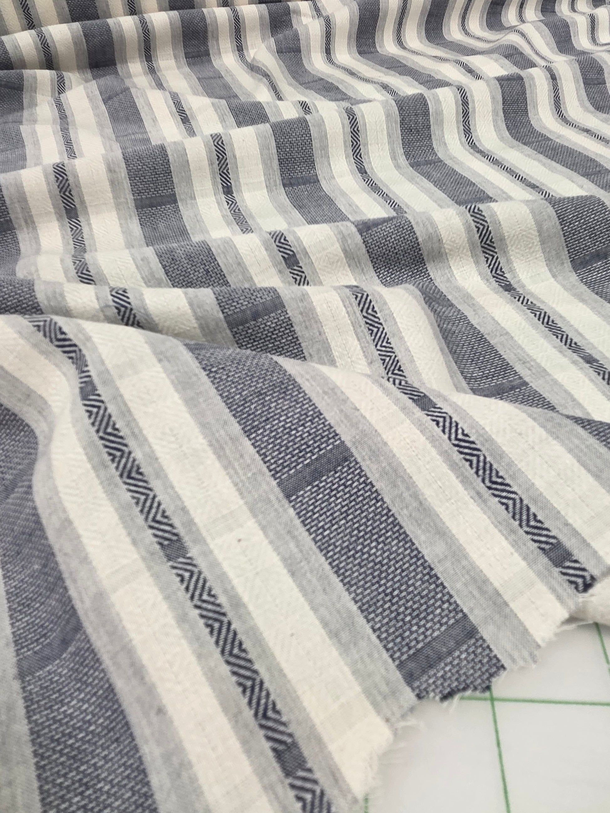 Description: A lightweight shirting weight woven. Flowy and breathable. Yarn dyed cotton with textured stripe jacquard.