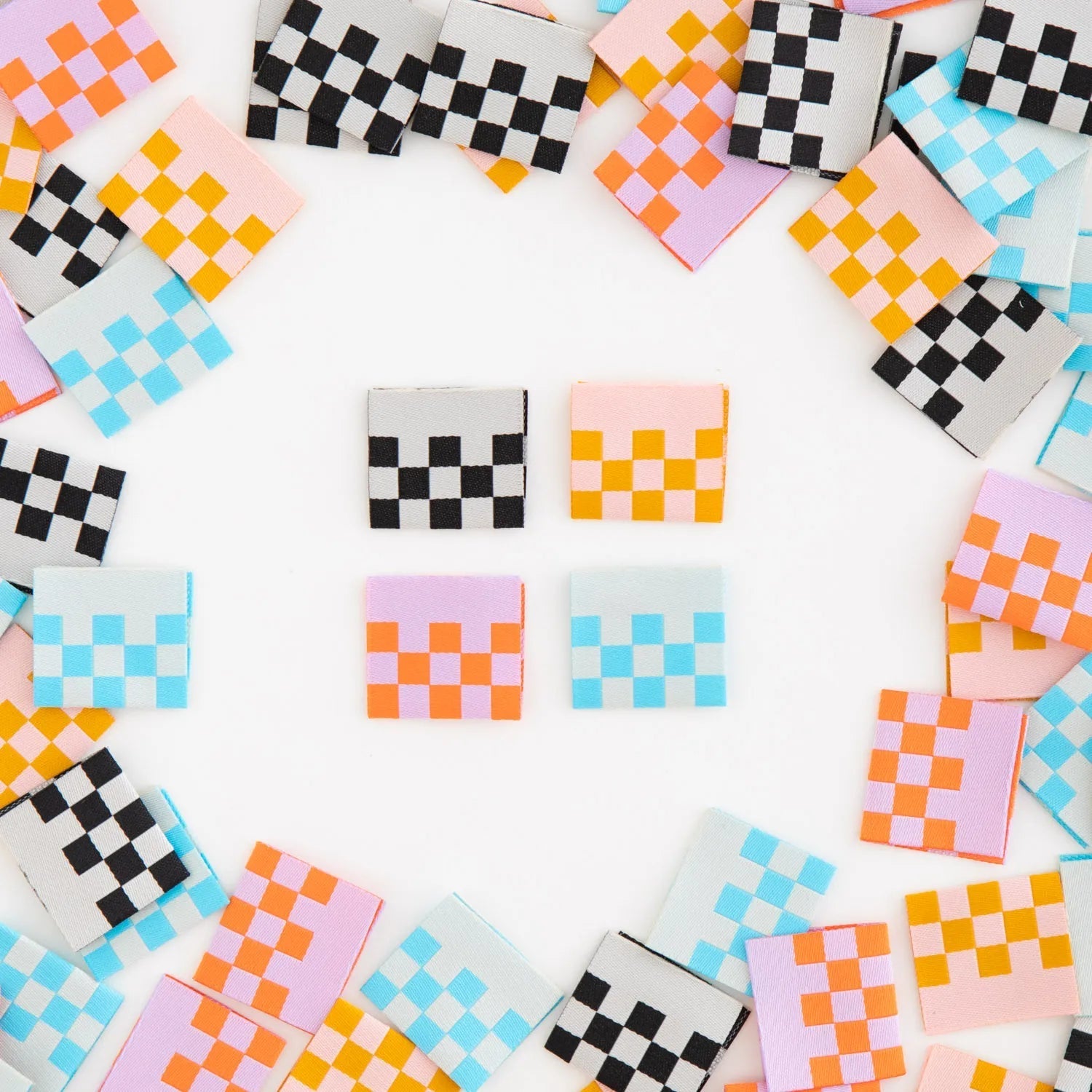 Are you crazy about checks? Then grab a pack of these fun labels to add to all your handmade sewing projects! Each multipack features 4 on trend colorful woven labels as shown in the photos above. Plus they are double-sided and feature the same checkerboard graphic on both sides of the labels. They are super soft to the touch and never scratchy. The labels are fully washable and can handle the heat of the dryer.
