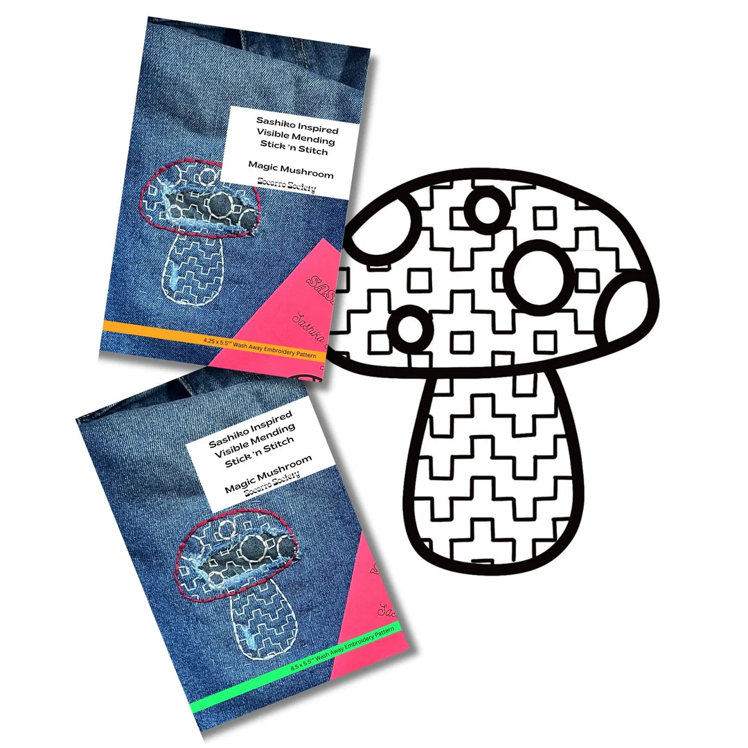 Sashiko Collection: Magic Small Mushroom- Visible Mending Stick and Stitch Adhesive Pattern(4.25"X 5.5")- 1 pack